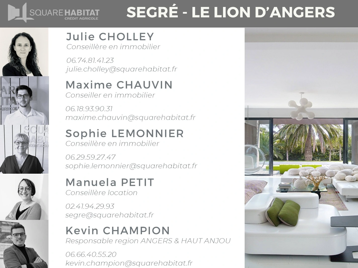 L'agence est à votre disposition aussi bien sur de la transaction que sur la location de biens sur le secteurs de Segré en Anjou Bleu, d'Ombré d'Anjou, du Candéen et du Lion d'Angers